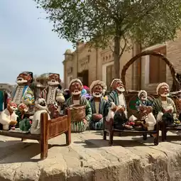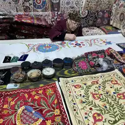 I arrived in Khiva's old city early in the morning before most tourists had arrived, so I was lucky to capture photos of the nearly empty ancient city. Although I knew it had been renovated, the restoration was beautifully done. Walking through the old city felt like being in a movie scene, with myself as one of the characters. The city's predominant earthy tones and its remote location made it feel like an ancient city in the middle of a desert. While you can explore the entire old city in half a day, there are so many unique items for sale that taking your time to stroll and browse is very enjoyable. Initially, I suspected that some of the souvenirs were mass-produced, but I saw artisans painting and embroidering items on the spot to prove they were handmade. Many tourists buy clothes to take photos because the designs perfectly match the scenery. By the afternoon, I noticed that almost the entire old city was filled with souvenir vendors, but the unique items they sold were not annoying at all.