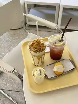 This cafe stands out with its clean, minimalist white decor, giving it a Korean-style cafe vibe. The drinks and desserts look delicious. I love the lighting inside the cafe, which is beautifully soft and warm, creating a warm and charming atmosphere. There are many photo spots to take photos from! ☺️