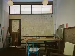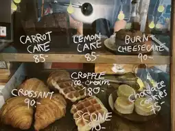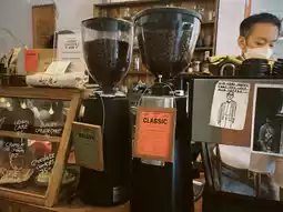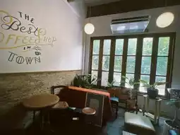 A coffee shop near Khlong San in a row of shophouses on the side of the road.