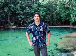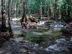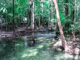 Emerald Pool in Krabi is a famous tourist attraction for its clear, blue-green water that changes color depending on the time of day and light. The pool is formed by a warm stream and has a temperature of around 30-50 degrees Celsius.