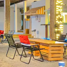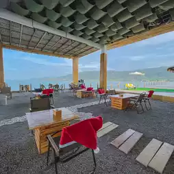 The tables are arranged to give a chill-out atmosphere by the sea. 𝙈𝙤𝙤𝙙 is super good.