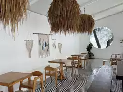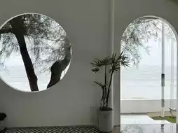 This cafe is decorated in a minimal, cozy beach house style, using white tones contrasted with earthy tones. The green 🍀 of the various plants, the brown 🪹 of the interior decorations, and the blue of the shop logo all look beautifully harmonious. The exterior is very spacious and right on the beach, with beautiful water.