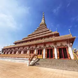 🛕 Phra Mahathat Kaen Nakhon, a nine-tiered pagoda with a square base measuring 50 meters on each side. The spire is a replica of Phra That Kham Kaen. Built on the occasion of the 50th anniversary of the accession to the throne of King Rama IX and the 200th anniversary of the Great Auspiciousness of Khon Kaen City, the 80-meter-high pagoda has 4 small relics located at the 4 corners and is surrounded by a 7-headed naga wall. It is a combination of Dvaravati and Indochinese art.