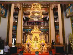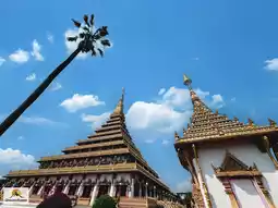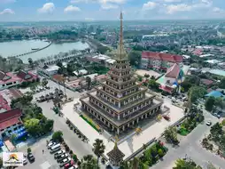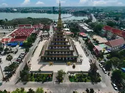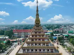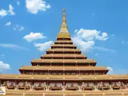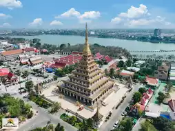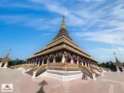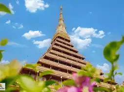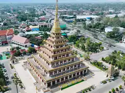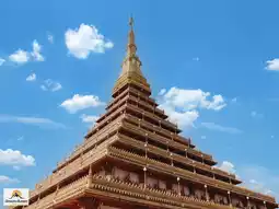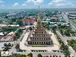 Located in Wat Nong Waeng, Khon Kaen Province, on the shores of Bueng Kaen Nakhon, this exquisite nine-tiered pagoda was built to celebrate the 50th anniversary of the reign of King Rama IX. It stands out for its Isan-Lan Xang architecture. The pagoda is 80 meters high, has a square base 50 meters wide on each side, and has four small chedis at the four corners of the base. Each floor displays Buddha images, antiques, and murals telling the history of Khon Kaen. The top floor offers a 360-degree view of the city.
