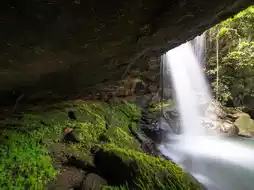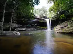Tham Puang Waterfall is a waterfall formed by the gathering of water from high places, flowing down from a cliff, which is a rocky outcrop, to the ground in the Tham Puang area, located in Ban Na Bua, Tambon Huai Yang, Amphoe Khong Chiam, Ubon Ratchathani Province. It is a waterfall that relies on flooding during the rainy season until November. To get there, take route 2222, turn left at Ban Nong Khong-Ban Na Bua until you find the entrance. Walk along the path until you find the waterfall. #tripแจกโรงแรมฟรี