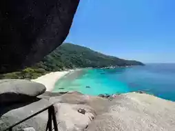 View from the top: See the clear blue sea, white sandy beach of "Ao Kueak" (horseshoe shape) and surrounding islands in 360 degrees.
