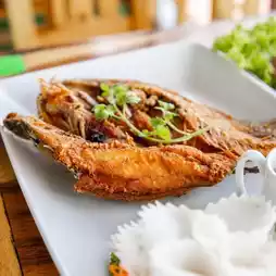 - Fried sea bass with fish sauce, I like the crispiness that is fried well, along with the sauce that you can choose to pour or pour yourself, 250 baht