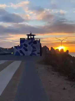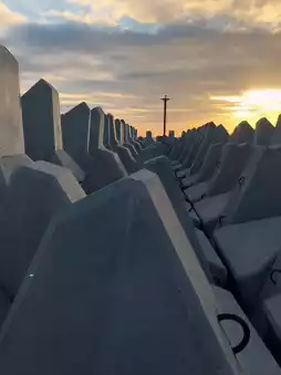 In the evening, fishermen are tidying up their gear from the day. You can park your scooter by the seawall and take a leisurely stroll towards the prominent concrete blocks, enjoying the tranquil sea breeze.