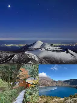- Mount Takachiho: Located on the border of Miyazaki and Kagoshima prefectures, the Takachiho River Gorge Visitor Center at the foot of the mountain has a wealth of information, including terrain models. The mountain slopes have terraced rice paddies and tea fields, and the mountainside is a reddish-brown cliff face. The color of the peak varies at different times of the day.
