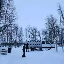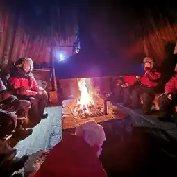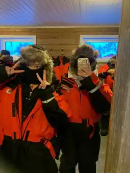 After changing, there will be an officer to explain how to ride. 1 sled can seat 2-3 people. After pulling halfway, the dog will stop to rest and we will move to sit in the house, warm ourselves by the fire. There will be tea and snacks for us to eat + take pictures with the dog. After that, we will take a ride back through the frozen lake and the church. The atmosphere is sooo good!