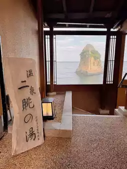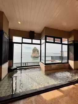 Right in front of you is "Nitsu Island." Enjoy the healing benefits of a cypress open-air bath while overlooking the ocean. ✨ The indoor bath also offers a spectacular view. 🤍
