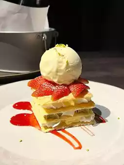 It was brought to us with pistachio cream, custard, and whipped cream sandwiched between pie crusts, topped with fresh strawberries and vanilla ice cream💕