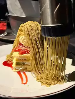 It's a luxurious dessert with pistachio Mont Blanc squeezed on top of it✨