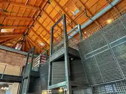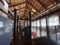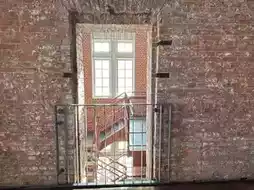 The open-ceiling entrance has a lovely contrast between the wood and brick.