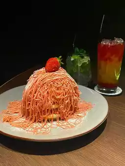 The staff did the Mont Blanc, powdered sugar, and strawberry topping for me, so I did the final strawberry sauce topping myself😊