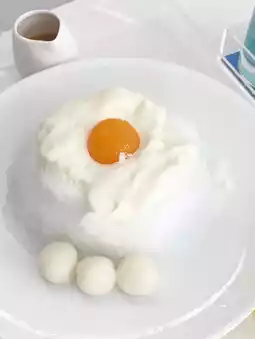 And the adorable fried egg-like shaved ice, topped with mango jelly on top of the fluffy meringue, is also a big hit!