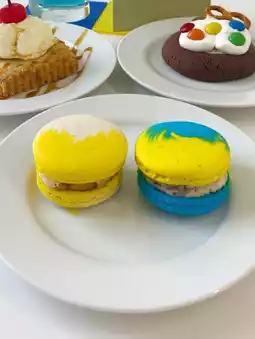 The macarons, featuring the cafe's theme colors of blue and yellow, had a gentle Earl Grey flavor and were incredibly delicious.