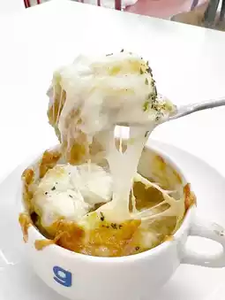 It's made in an open cup, so I was careful about the hot cup, but the salty cheese, sweet onions, and plenty of baguette were irresistible✨