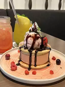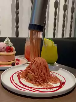 They have started a delicious strawberry tart with strawberry Mont Blanc arranged right in front of you, and luxurious pancakes with 3cm thick butter cream!