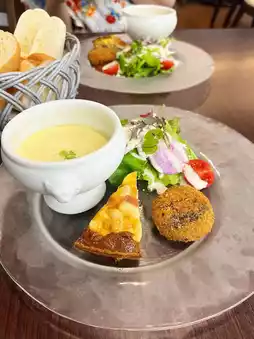 The soup was cold soup and the salad dressing was cheese and delicious 🤤