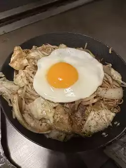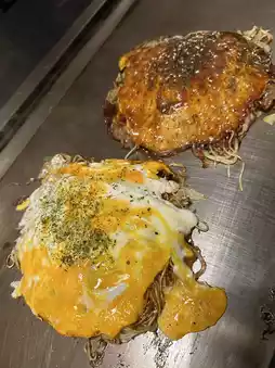 The okonomiyaki here is Hiroshima-style, so there are noodles underneath💗