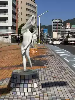 It's a trick art piece designed so that the shadow of his head reflected on the sidewalk around the spring and autumn equinoxes will take the shape of the city's flower, a 🌻sunflower🌻! !