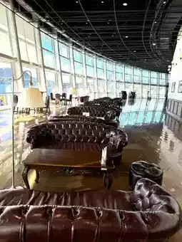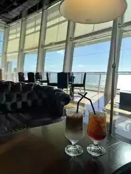 A lounge space modeled after the deck of a luxury cruise ship from the Taisho and Showa eras, where you can enjoy a coffee break while looking at the sea☕️