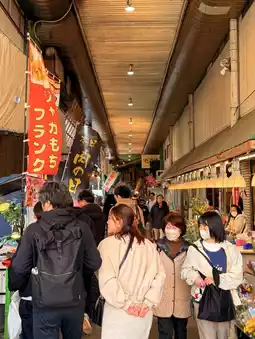 Danguo Market is not far from Uomachi Gintengai, and tourists usually visit them together, but their development histories are slightly different. There are many different opinions about the origin of the name of Dango Market. One theory is that there used to be an inn here where traveling monks would leave early in the morning, so it was called Dango Ryo. In the early Taisho era, this was where ships going upstream on the Kamigaku River exchanged fish, and nearby villages would also bring their crops here to sell, so it naturally developed into a market. After World War II, it developed into a black market. Later, after rectification, it formed a market with 120 stores, selling fresh food, cooked food, and seafood. It is very similar to Taiwan's traditional markets and is affectionately called the Kitchen of Kitakyushu.