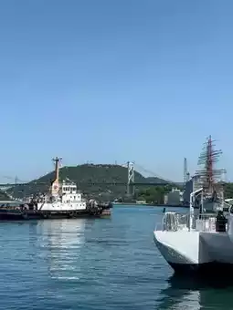 First, walk towards the port and you will see the Kanmon Bridge. The port with the ships docked and the Kanmon Bridge, a great view. And on the opposite side you can already see Shimonoseki in Yamaguchi Prefecture.