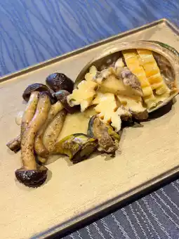 A perfect treat, featuring teppanyaki abalone, Japanese Black beef, and vegetables, followed by a sweet treat after the meal🫧
