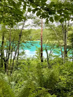 It's the second largest of the Goshikinuma Ponds, reflecting sunlight beautifully and shining brightly. Unfortunately, it was the height of the rain, so we couldn't see the Agatsuma Mountains in the distance.