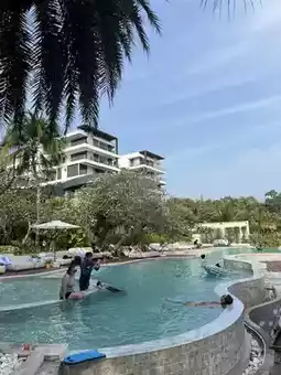 We recommend the best seaside accommodation in Rayong, Mercure Lomtalay Resort. This place allows you to bring your dogs, cats, and small pets. The accommodation is right by the beach, with a pool that has a great view. It's very quiet, peaceful, and clean. Instagram enthusiasts will love it because there are plenty of photo spots with perfect lighting everywhere. If you're planning to stay here, bring lots of outfits for photo opportunities. You will definitely get great pictures.