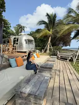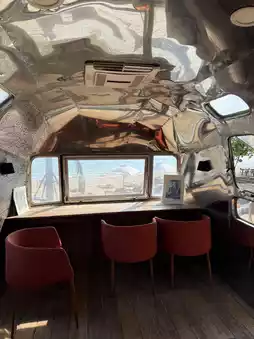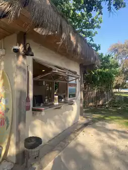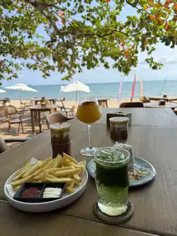 The menu offers a wide variety of choices, including main dishes, snacks, beverages, and a complete selection of bakery items. The cafe is spacious with multiple seating zones to choose from, such as the bar area, camper van zone, and beachfront zone. There are plenty of picturesque spots for photography, especially around the camper van area 📷.