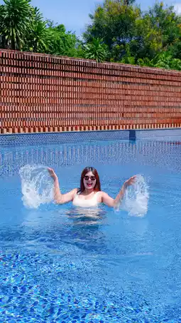 - The main pool, adorned with artistic sculptures and a red brick wall backdrop, offers a spacious and stylish setting suitable for family fun or romantic getaways.