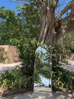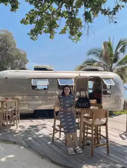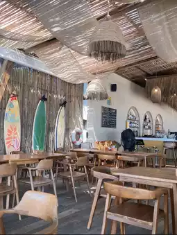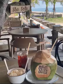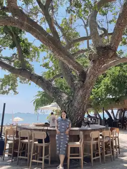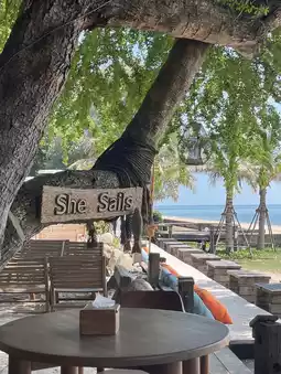 This beachfront restaurant and cafe is decorated in a Balinese style. There's plenty of seating, and it's completely open-air, but it's not hot at all. The breeze blows constantly, making it very chill. The atmosphere is great, with a DJ playing beautiful music. It's perfect for families, groups of friends, or couples. They offer a wide selection of food, drinks, and desserts. If you come in the evening, the lighting should be nice and the atmosphere should be cool. However, we went at noon, when the sun was hot and the lighting wasn't great for photos. There were a lot of people, but there was ample seating. We ordered coconut water, Americano, and ice cream, as we had already eaten, so we didn't try any food. The drinks were okay, but the ice cream was delicious. Parking is available across the street. The staff are friendly and helpful, and the beach is beautiful, perfect for taking photos from every angle. A must-visit if you're in Rayong.