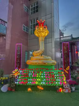 Locals and visitors stroll through the temple grounds, take photos, make wishes, and enjoy the cultural atmosphere. The highlight? A massive golden snake display paired with traditional music echoing in the background.