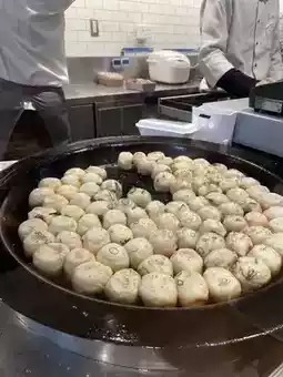 A long line of people is lined up around the shop along the wall. The black brick walls are quite stylish and attractive, so I take pictures with a little embarrassment, and the guard gives me a QR code to read the menu, and while I'm wondering what to order, the line moves surprisingly quickly. When I reach the front of YUNYUN, I can see the craftsmen skillfully making baked xiaolongbao through the large window, and I can't stop drooling with excitement!