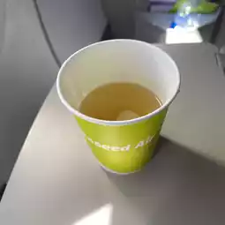 The seats are arranged in a 3:3 configuration. Free drinks were provided on the Naha route. There was a soup made with Kyushu-produced flying fish dashi and yuzu, so I had one. It was a soup with a savory dashi flavor and a hint of yuzu.
