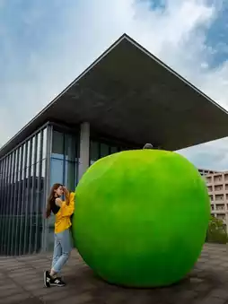 ☑️A photo of a really long bookshelf☑️A photo of a girl☑️A photo of someone sitting in a triangle☑️A photo of a green apple☑️A spiral staircase