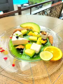 A plate of melon🍈 jelly topped with melon, mango pulp, cheesecake, waffle cone, and nuts👩🍳