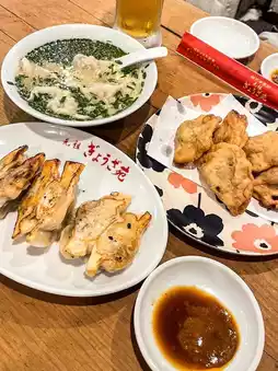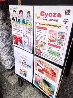 The gyoza menu includes fried gyoza, boiled gyoza, deep-fried gyoza, and soup gyoza.