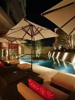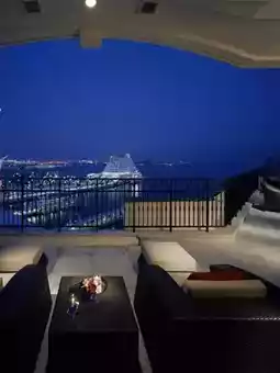 A hotel surrounded by the lights of the harbor, with ocean view terraces in all rooms