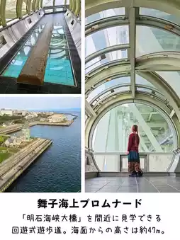 A promenade where you can get up close and personal with the Akashi Kaikyo Bridge, one of the world's largest suspension bridges. It is about 47 meters above sea level. The view of the ocean from the transparent glass windows at your feet is also beautiful.