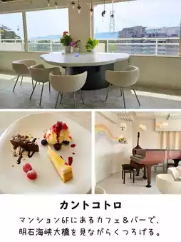 A cafe on the 6th floor of an apartment building where you can enjoy lunch or a cafe while looking at the Akashi Kaikyo Bridge, and a bar at night. The white-based interior is just so cute.