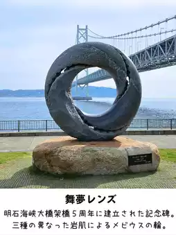 A monument erected on the 5th anniversary of the construction of the Akashi Kaikyo Bridge. The Möbius strip made of three different rock surfaces represents people, nature, science, and Honshu, Awaji, and Shikoku, which are connected by the Akashi Kaikyo Bridge.