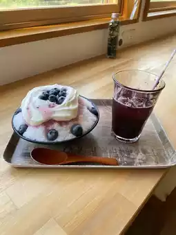 The fresh blueberries were delicious and not bitter or sour. The shaved ice was made with rare fresh blueberries. There are fruit trees growing next to the store, and you can pick them yourself (book in advance). This is a cafe we highly recommend for a summer drive.