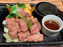 This is a Kobe beef steak restaurant located on the 1st floor of Mosaic Kobe, Japan. It is a steak restaurant that is very popular with tourists because this restaurant has the highest score in Google reviews. The restaurant has a good atmosphere with an open area for eating outside and seating inside. There is a garden and a small canal in front of the shop.