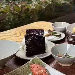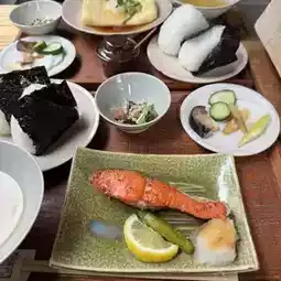 They offer set meals featuring dishes like rolled omelet, grilled mackerel, and grilled salmon, all served with miso soup, pickles, and either rice balls or rice in a wooden container.