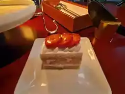 The middle is made up of sweets such as strawberry whipped cream cake, macaroons, and jelly panna cotta.