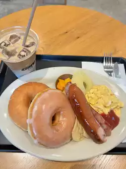 This time, I opted for the morning plate 🍳🥓. It features a fluffy donut, juicy sausage, scrambled eggs, and even some fruit. The vibrant presentation lifts your spirits right from the start of the day!